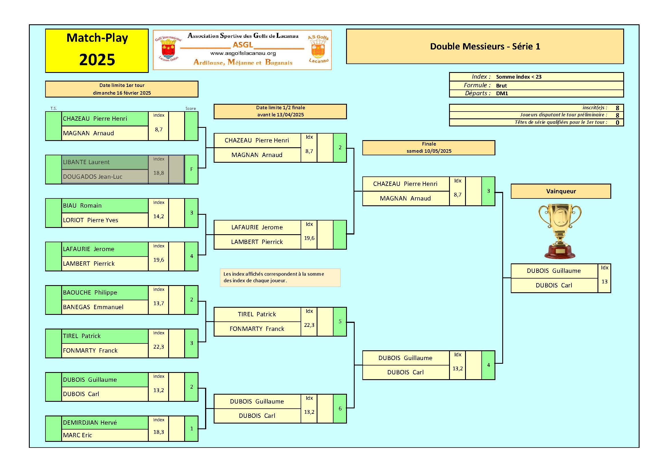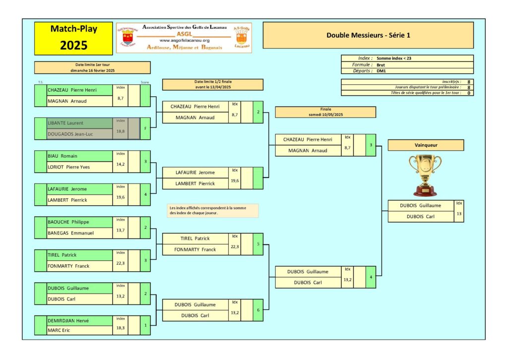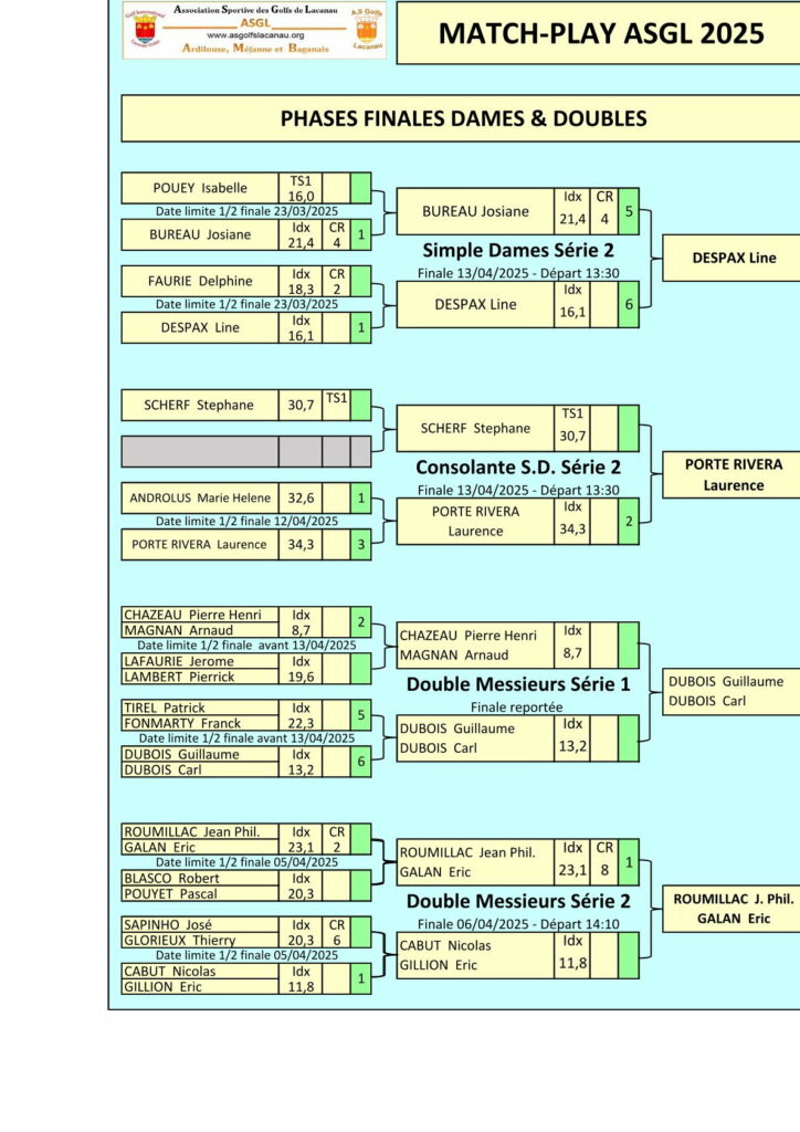 La sixième édition du championnat d’hiver de match-play est maintenant terminée (ou presque, une finale reste à faire au bon vouloir des finalistes…). Belles finales en tout cas les 6 et 13 avril avec une remise des prix sous le soleil.